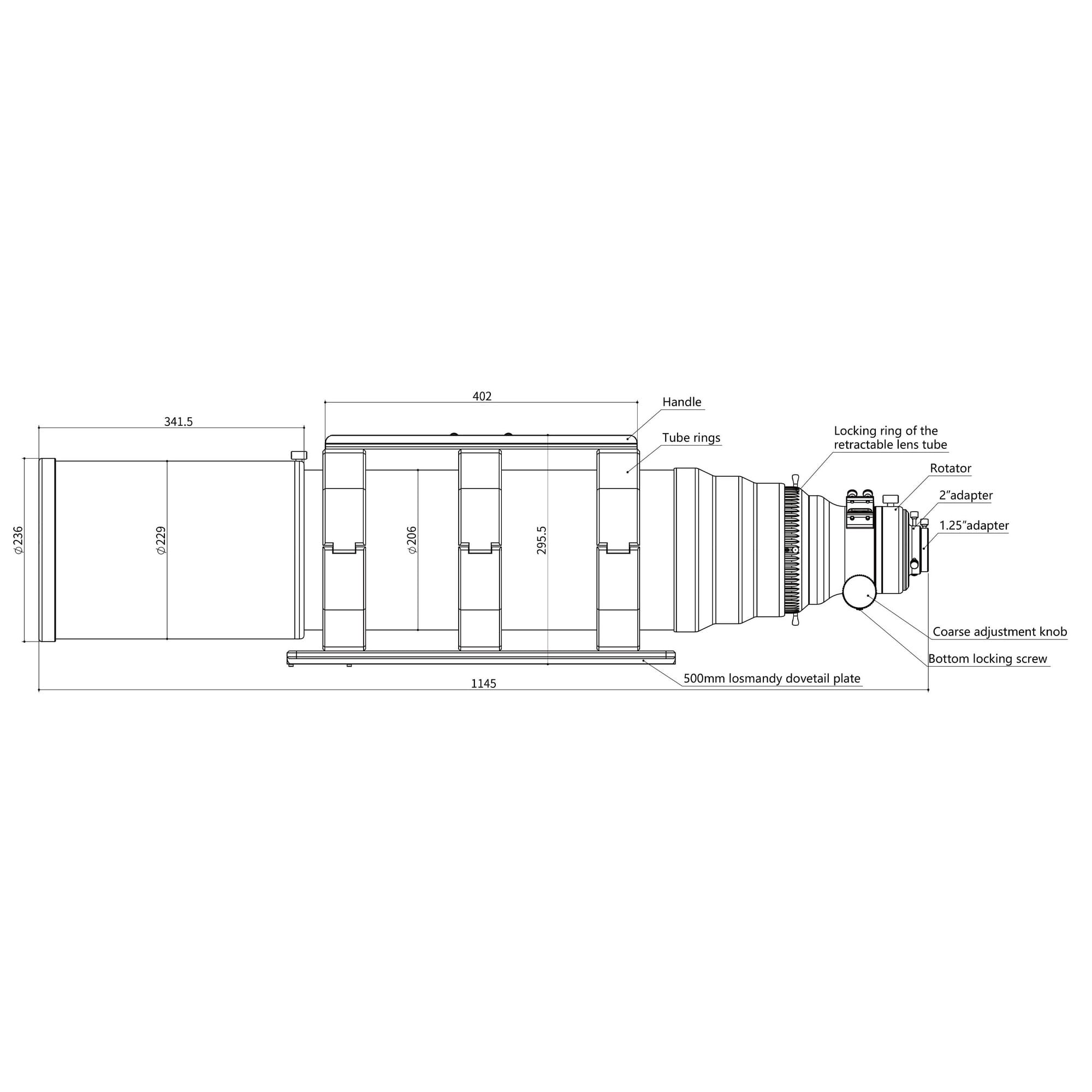 De telescoop wordt geleverd met stevige buisringen, een Losmandy-zwaluwstaart en een transportkoffer. Met een buisgewicht van 23,5 kg is een zware montering zoals de Sky-Watcher EQ8-R (Pro of RH) aan te raden om de volledige prestaties te benutten.