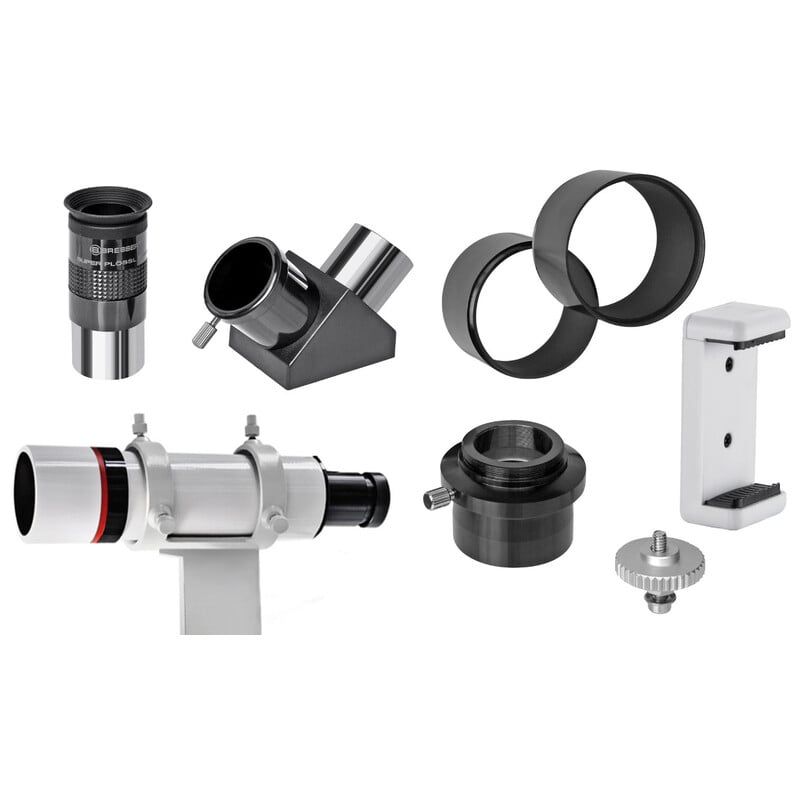 Alles wat je nodig hebt zit erbij: oculair, zoeker, zonnefilter, statief en smartphone-adapter. Binnen enkele minuten ben je klaar om de hemel te verkennen — van zonnevlekken tot verre sterrenstelsels.
