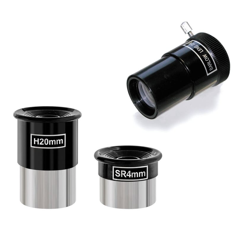 Alles wat je nodig hebt zit erbij: oculairs, Barlow-lens en zonnefilter. Binnen enkele minuten sta je klaar om te observeren. Dankzij de lichte aluminium montering neem je hem gemakkelijk overal mee naartoe.