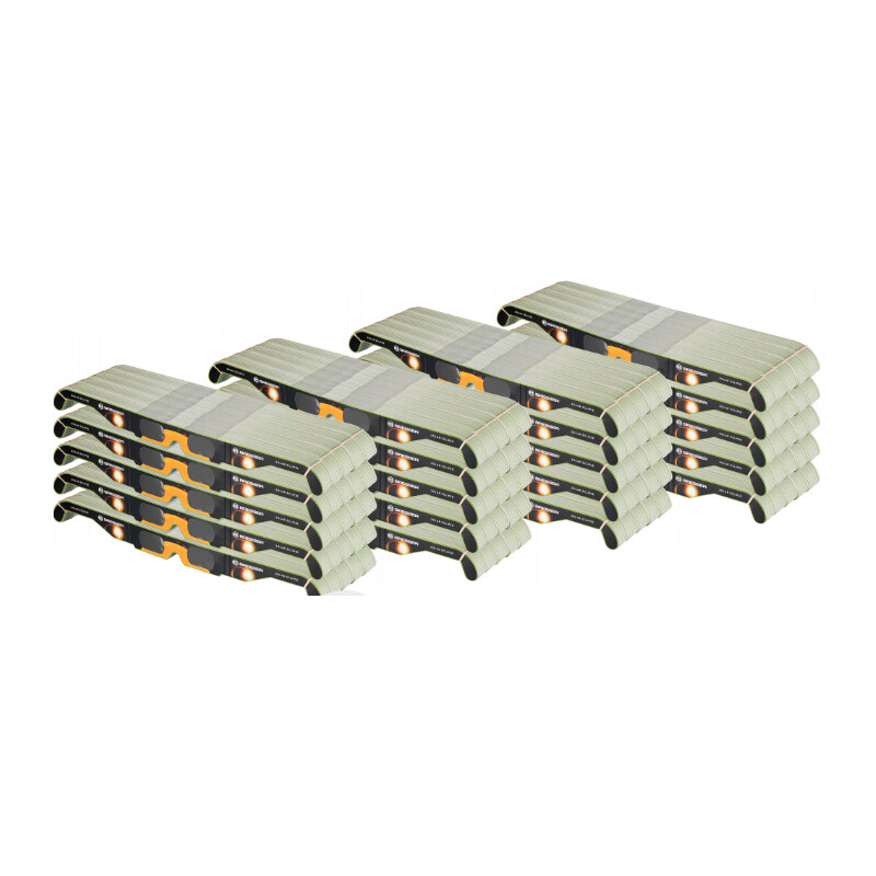 De Bresser zonsverduisteringsbril is verkrijgbaar in verschillende verpakkingen (3, 5, 10, 25, 50 of 100 stuks), zodat je eenvoudig kunt kiezen wat past bij jouw situatie, van individuele waarneming tot educatieve groepsactiviteiten.