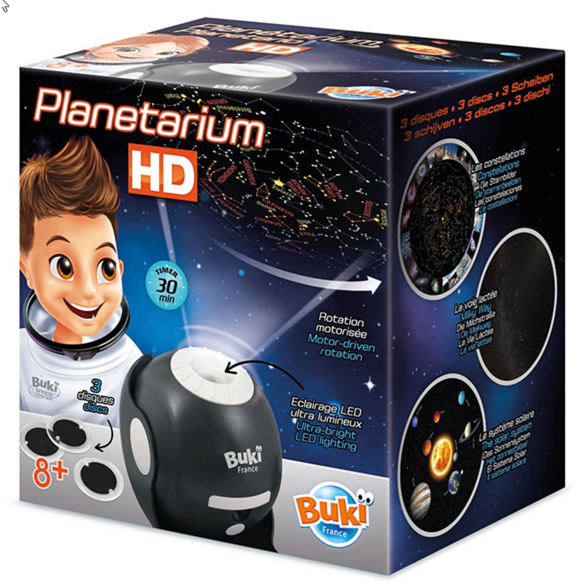 Buki sterrenhemel projector HD wordt geleverd met drie dia-schijven, ingebouwde rotatiemotor en automatische timer, ontdek de Melkweg, sterrenbeelden en het zonnestelsel vanuit je eigen kamer.