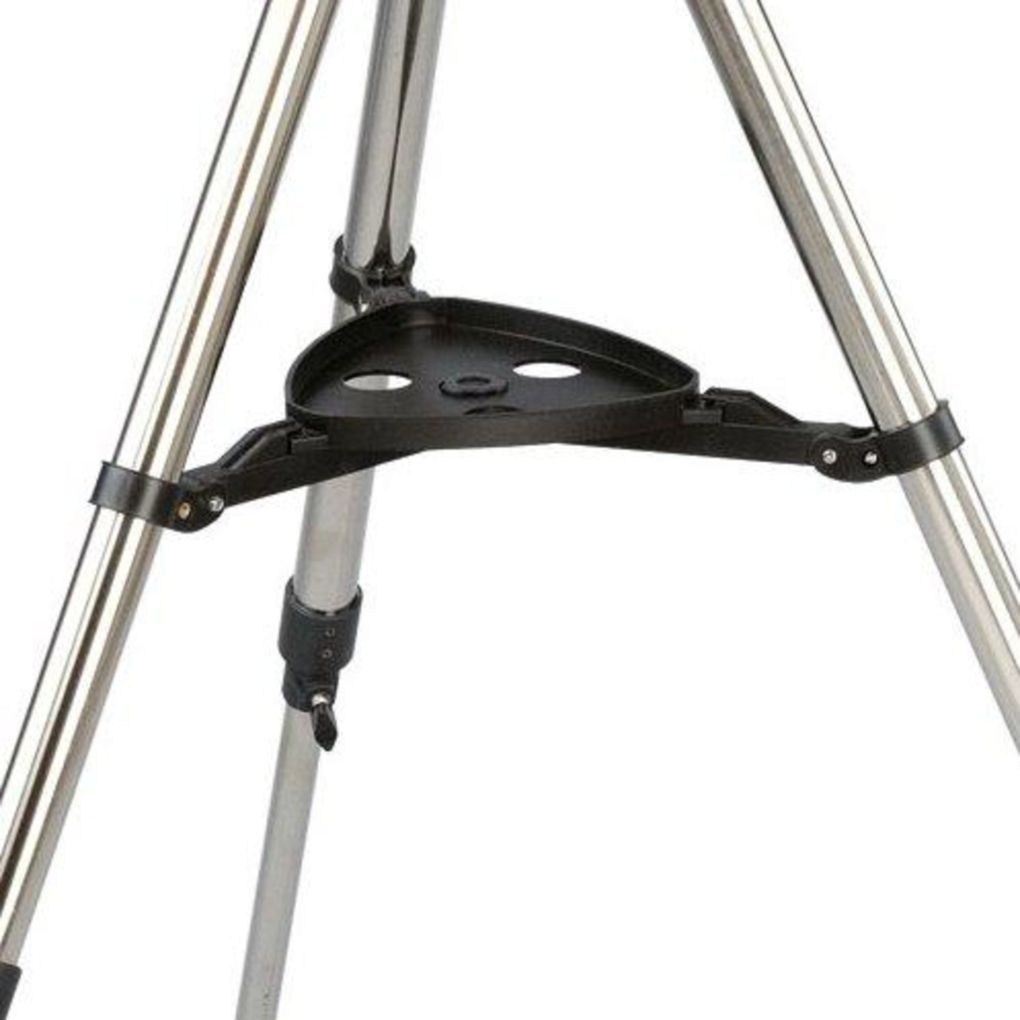 De telescoop staat op de Celestron CG-2 parallactische montering, die stabiliteit en nauwkeurige bewegingen biedt. Met de flexibele assen en instelschaaltjes kun je hemellichamen handmatig precies volgen. Het stevige stalen statief is in hoogte verstelbaar en voorzien van een accessoireplateau. Voor extra gebruiksgemak kan later een volgmotor worden toegevoegd.