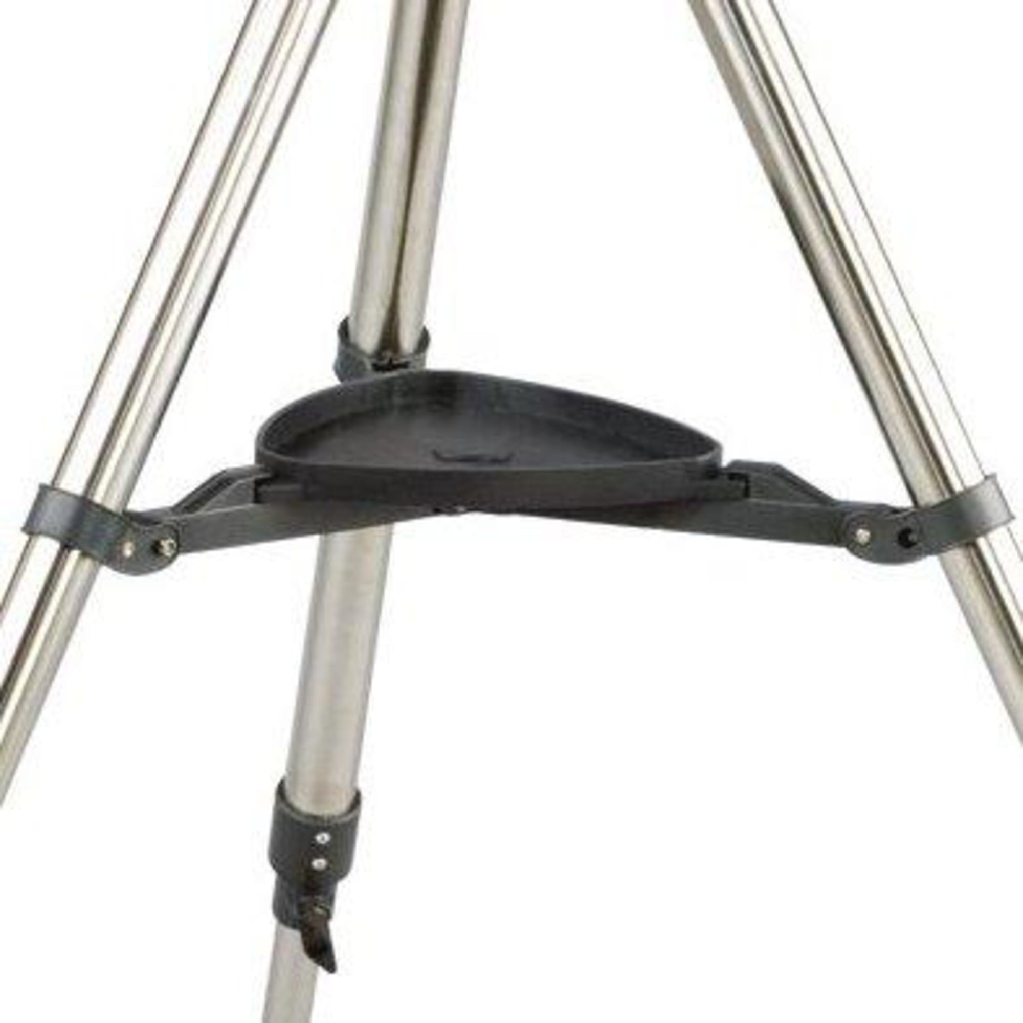 De Celestron AstroMaster 70AZ staat op een stalen statief met verstelbare poten en een accessoireplateau voor oculairs en filters. De complete set inclusief 20 mm en 10 mm oculairs is zonder gereedschap in enkele minuten opgebouwd. De solide constructie beperkt trillingen, wat prettig is bij hogere vergrotingen.
