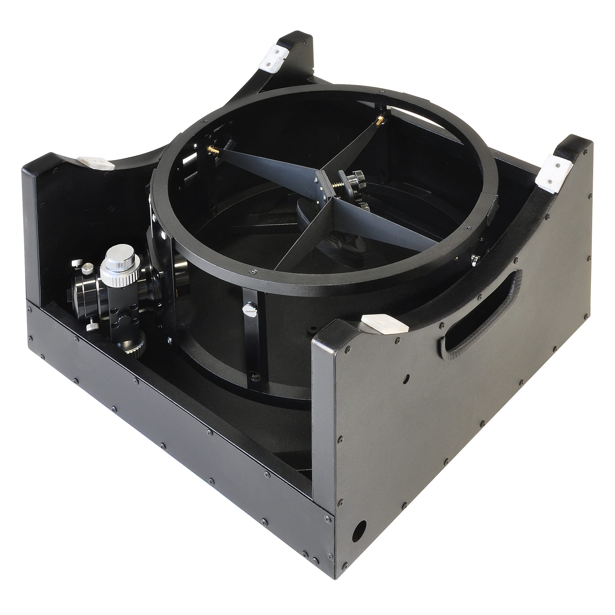 De parabolische hoofdspiegel van hoogwaardig BK7-glas levert een contrastrijk, scherp beeld, zelfs bij hoge vergrotingen. De moderne 9-punts spiegelcel met radiale lagers zorgt voor een stabiele ondersteuning en eenvoudige collimatie van voren. Twee ingebouwde ventilatoren brengen de spiegel snel op omgevingstemperatuur, zodat je binnen enkele minuten kunt observeren zonder optische turbulentie.