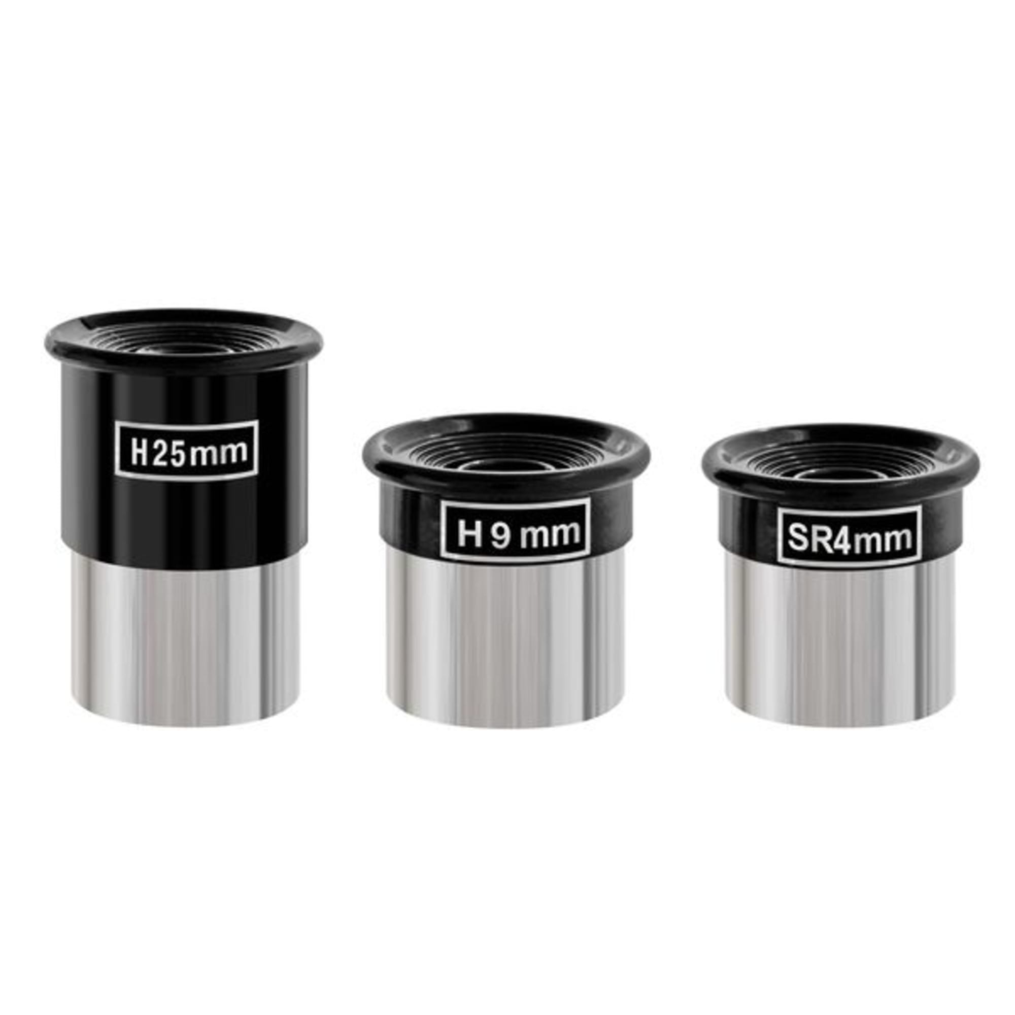 Oculairs: 25 mm, 9 mm en 4 mm (1,25″)