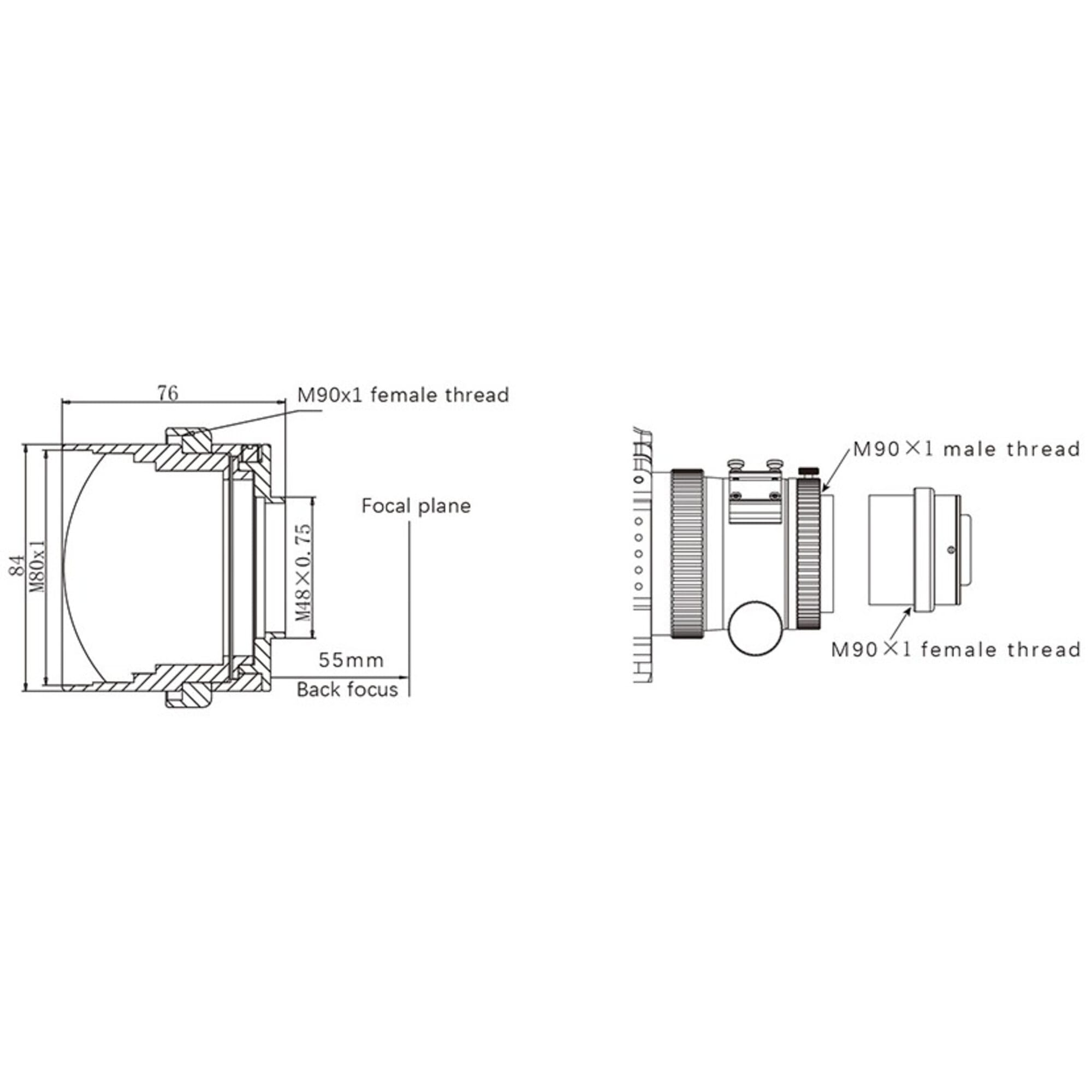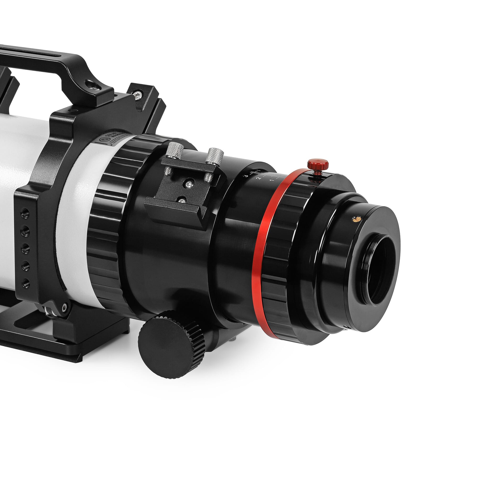 Aan de telescoopzijde beschikt de reducer over een M80x1 en M90x1 binnenschroefdraad, terwijl de camerazijde een M48x0,75 buitenschroefdraad biedt. Met een backfocus van 55 mm en een extra interne M48-filterschroefdraad is er ruimte voor filters en adapters. Bovendien kan de cameraflensflens gedraaid worden met behulp van drie bronzen stelschroeven, zodat je de beeldhoek exact kunt uitlijnen.