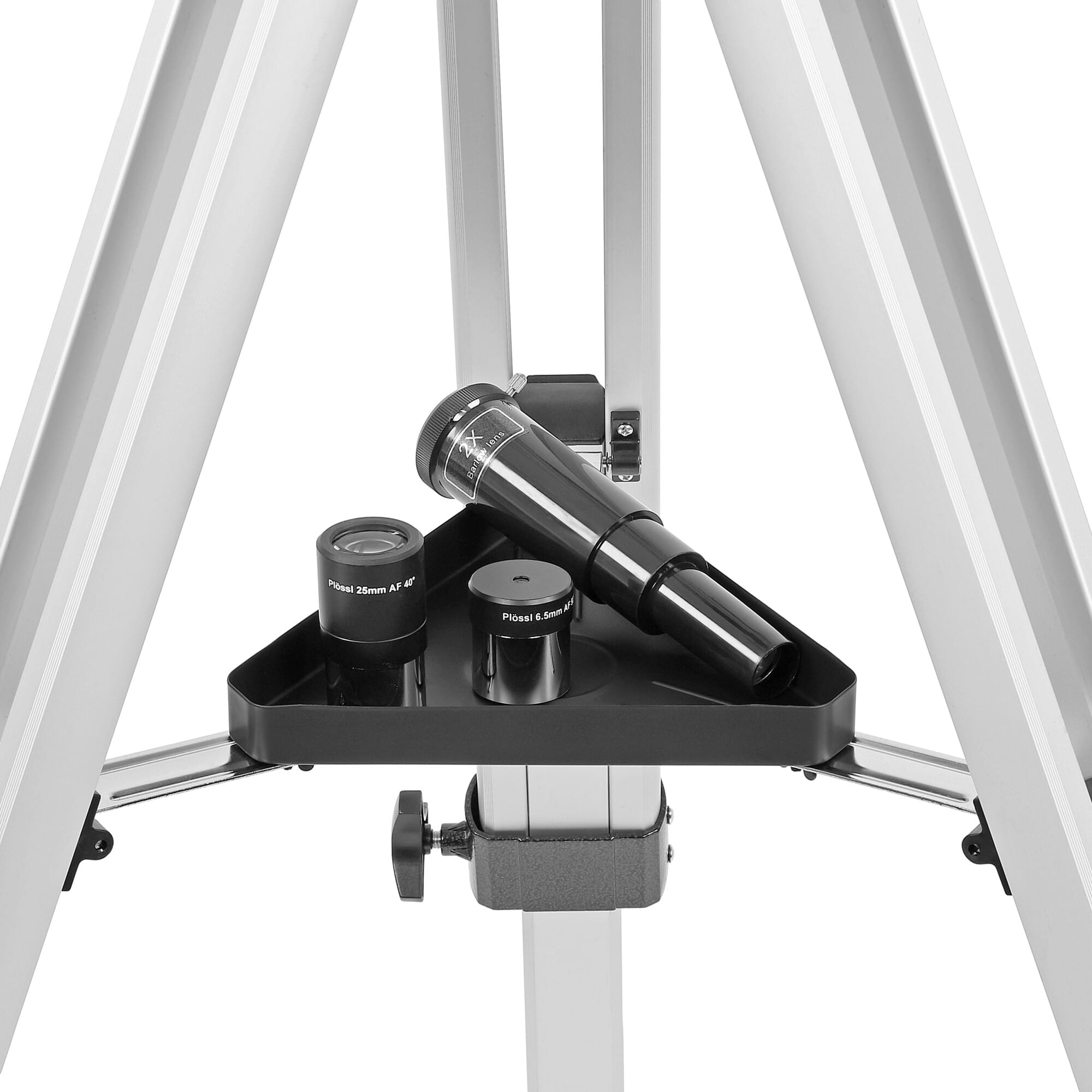 Het aluminium statief is in hoogte verstelbaar en voorzien van een accessoireplateau, zodat je oculairs altijd binnen handbereik zijn.