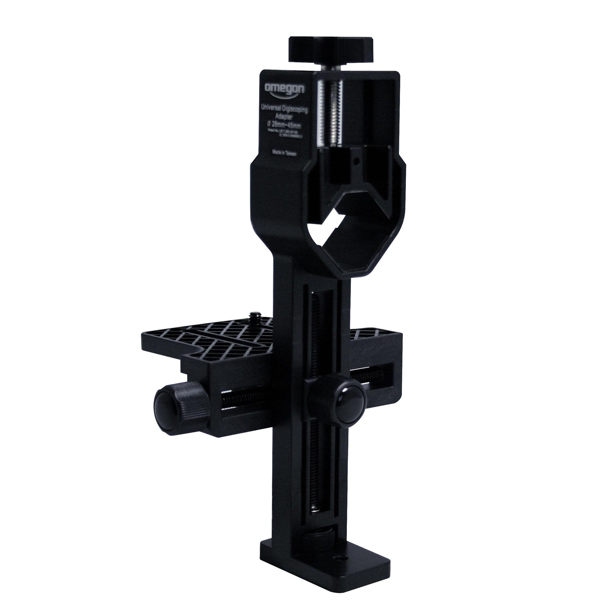 De adapter klemt stevig rond cameralenzen met een diameter van 28–45 mm en is belastbaar tot 2 kg. Dankzij de universele 1/4″ statiefaansluiting past hij op vrijwel elke camera met standaard statiefdraad. Dit maakt hem breed inzetbaar voor zowel astrofotografie als digiscopie.