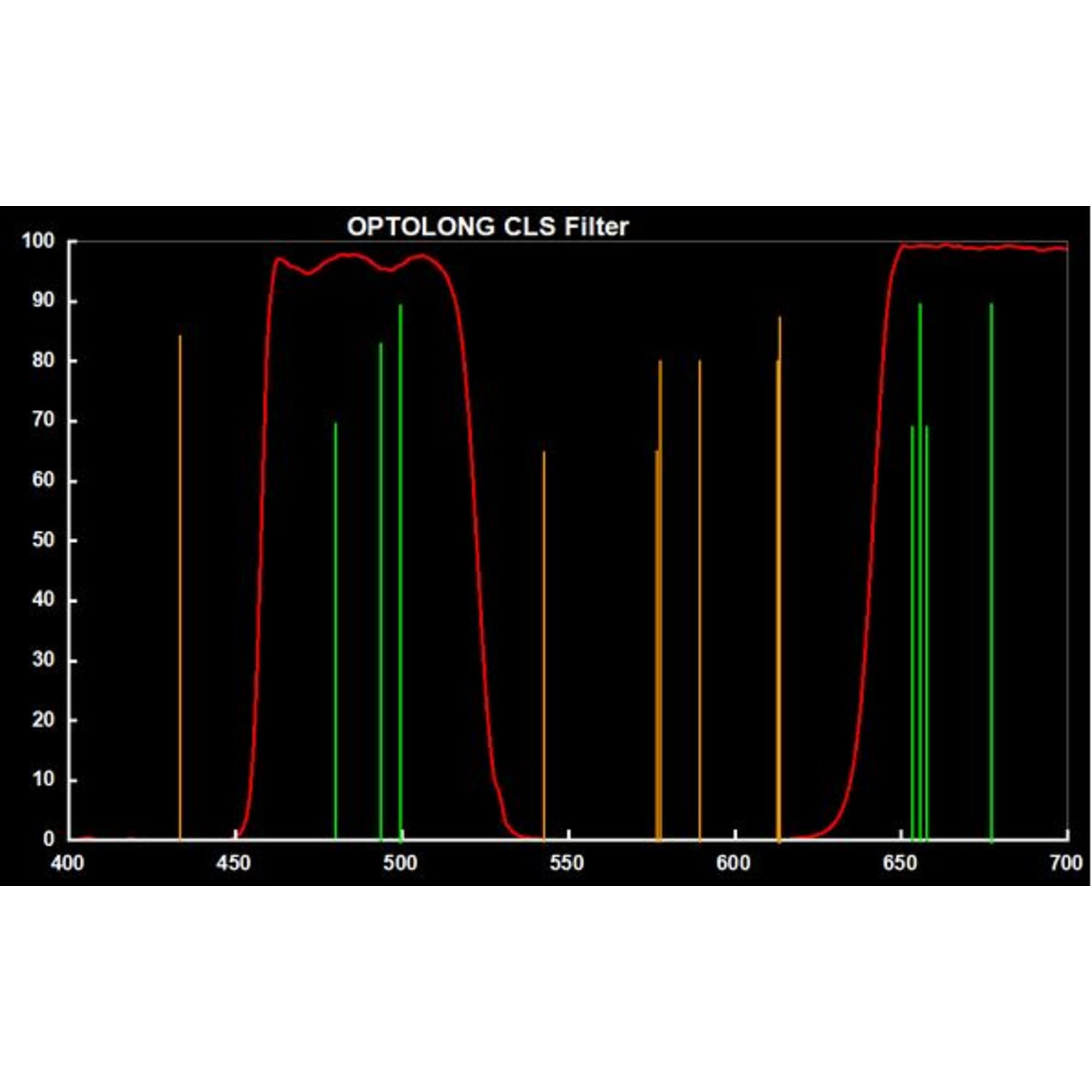De CLS-filter laat tegelijkertijd de emissielijnen van nevels door – waaronder OIII (496/500 nm), H-bèta (486 nm), NII (654/658 nm), H-alfa (656 nm) en SII (672 nm). Dit verhoogt het contrast en maakt meer details zichtbaar bij emissienevels, planetaire nevels en supernovarestanten. Dankzij het bredere doorlaatbereik is de CLS-filter met name geschikt voor licht tot matig vervuilde hemels en werkt hij uitstekend met ongemodificeerde DSLR’s en CCD-kleurencamera’s.
