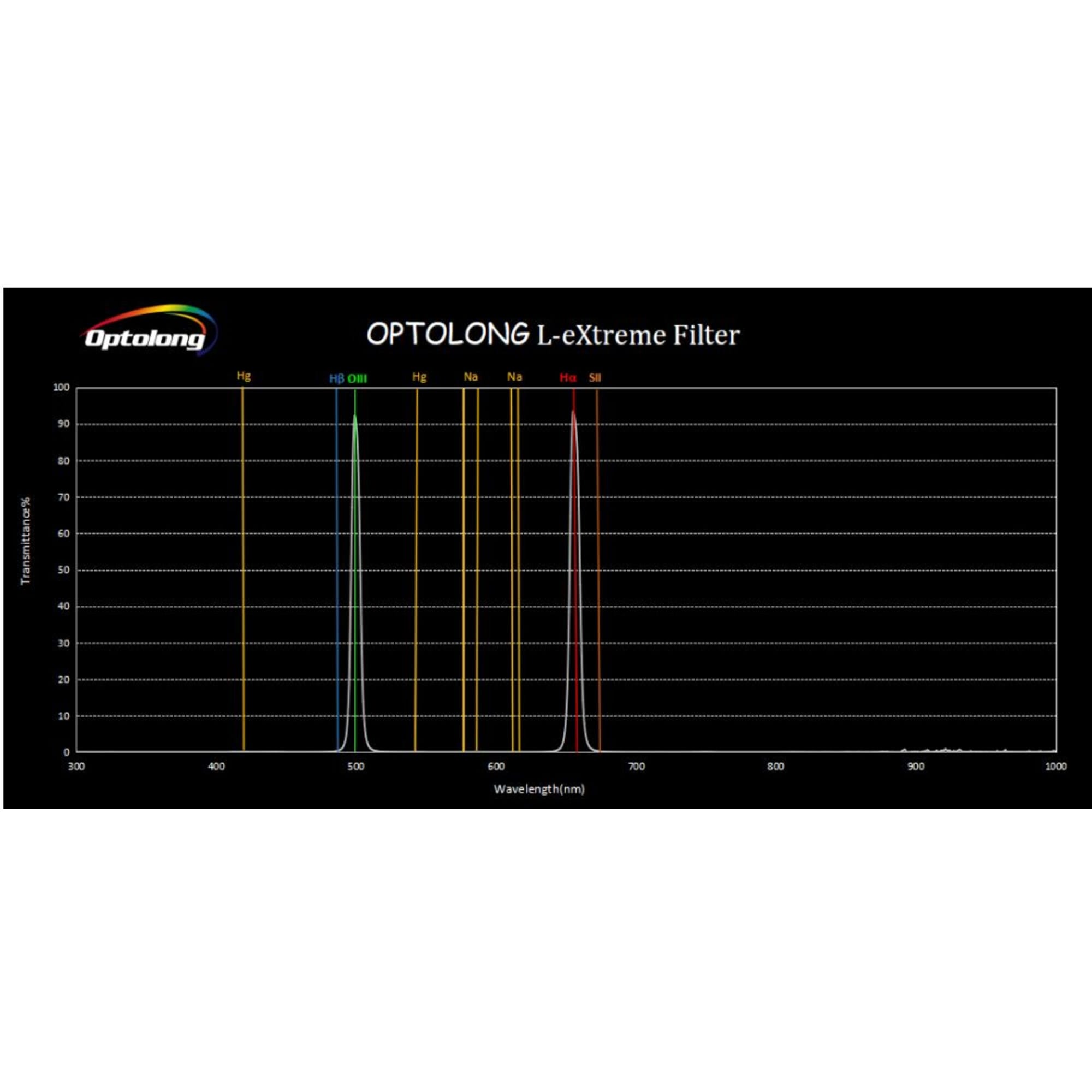 Optolong Filters L-eXtreme 1,25″ is een hoogwaardig smalbandfilter dat speciaal ontwikkeld is voor astrofotografie van emissienevels met kleurencamera’s (OSC) en DSLR’s. Het filter laat slechts twee belangrijke emissielijnen door: H-alfa (656 nm) en OIII (500 nm). Storende golflengten van kunstlicht worden vrijwel volledig geblokkeerd, waardoor nevels veel contrastrijker en helderder op de foto verschijnen.
