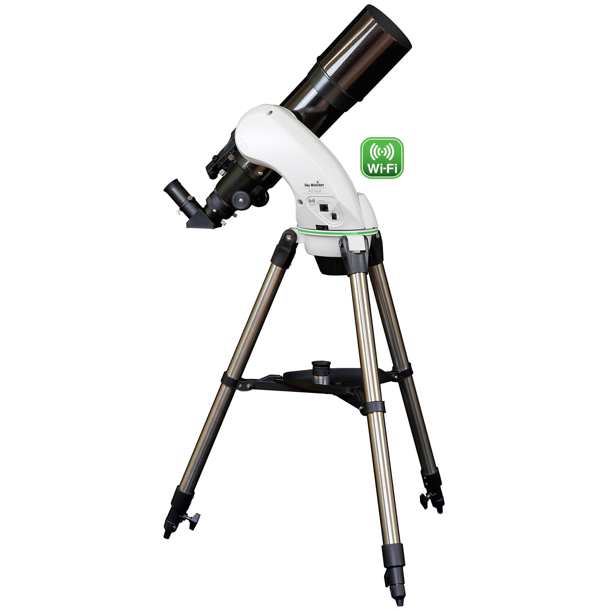 De AZ-Go2-montering beschikt over stille servomotoren die de hemelrotatie automatisch compenseren. De éénarmige constructie is licht, stabiel en voorkomt botsing bij het richten naar het zenit. Dankzij de Vixen-Style zwaluwstaart kun je ook andere buizen of instrumenten monteren. De telescoop werkt op batterijen of een 12V-adapter (niet meegeleverd).