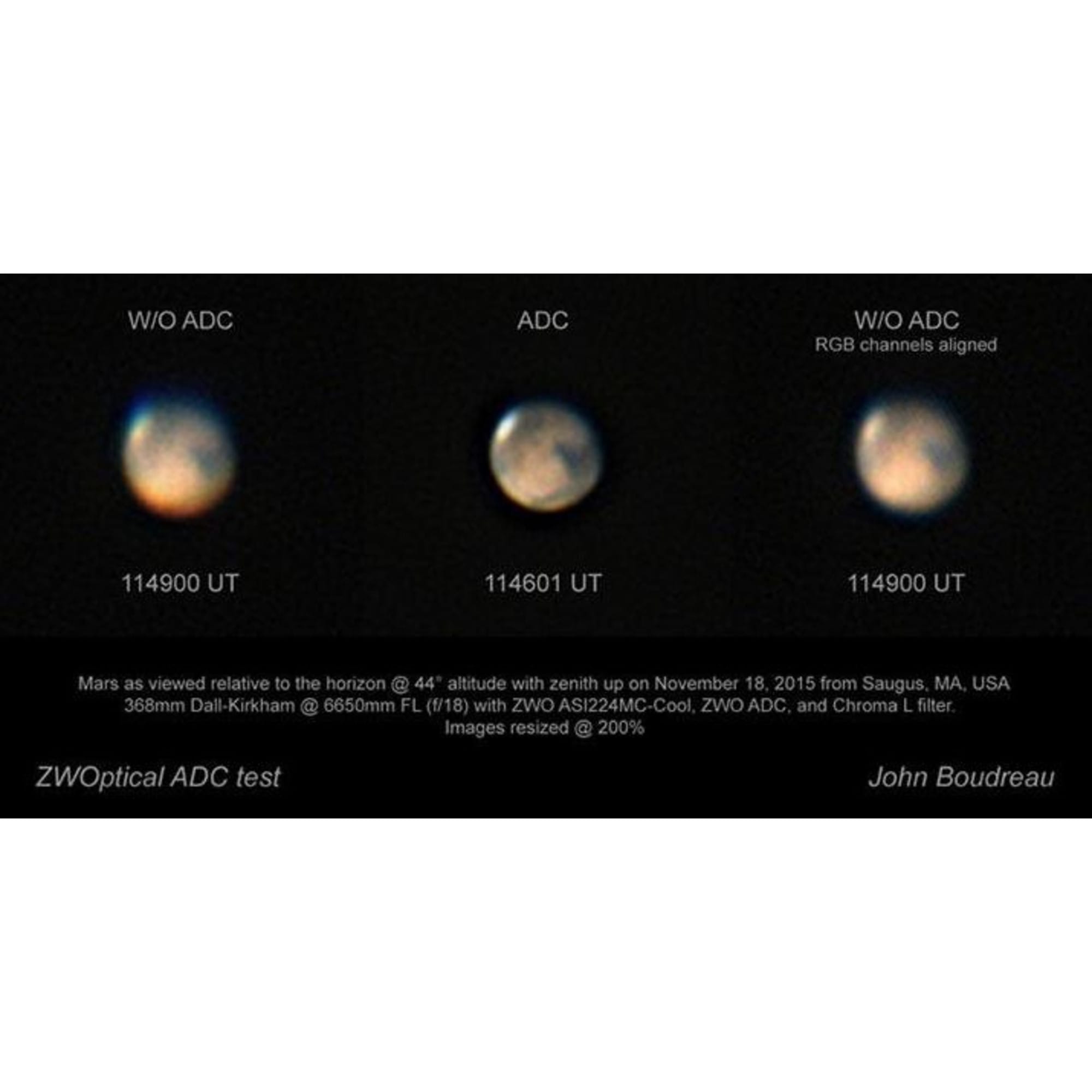 De ZWO ADC Mark II corrigeert atmosferische dispersie, oftewel de regenboogachtige kleurzweem die ontstaat wanneer licht door de dampkring breekt. Vooral bij lage hoogtes boven de horizon zie je dit effect sterk terug bij planeten en heldere sterren. De ADC Mark II gebruikt twee nauwkeurig instelbare prisma’s die een tegengestelde breking veroorzaken, waardoor alle kleuren weer samenvallen. Het resultaat: haarscherpe en kleurechte beelden, zowel visueel als fotografisch.
