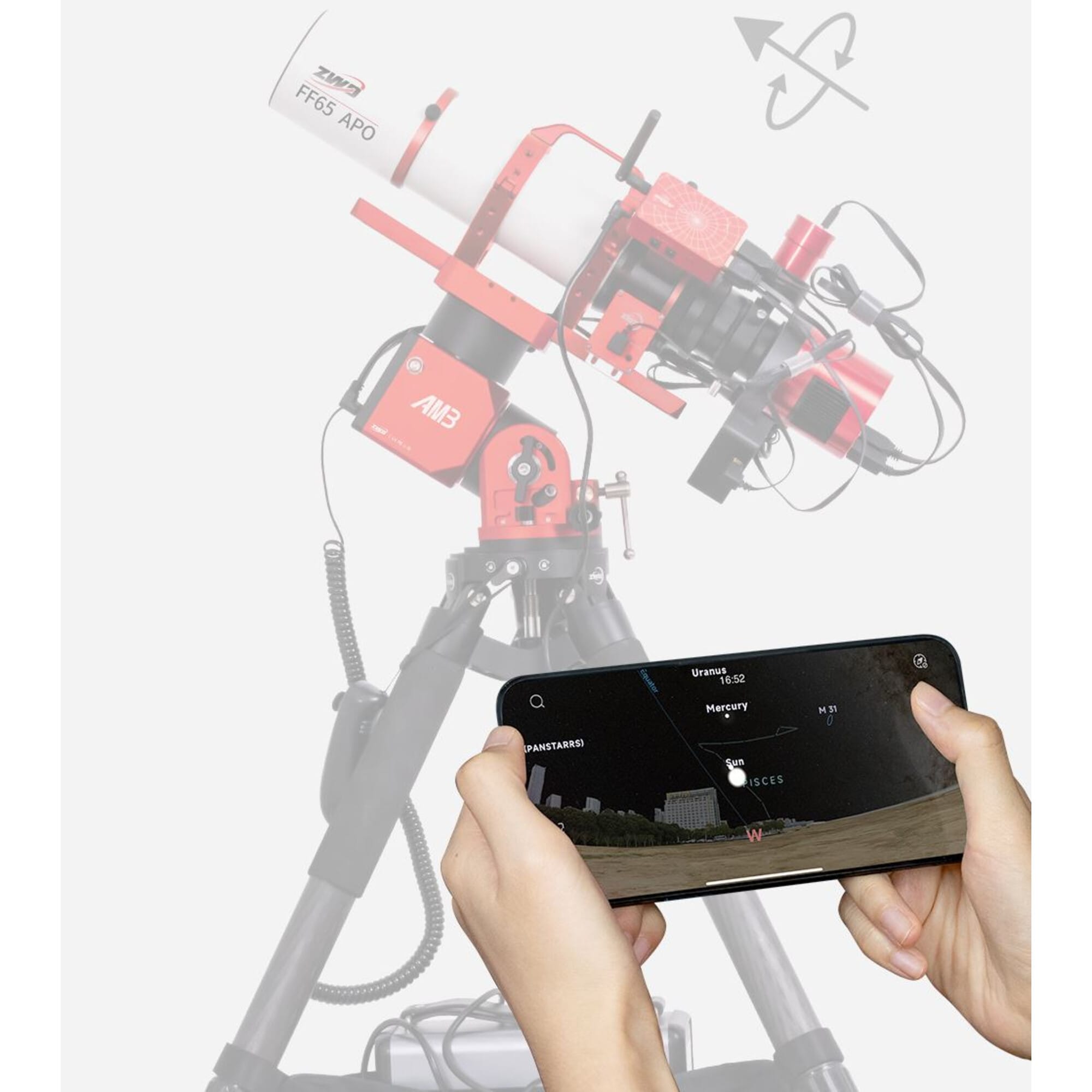 De AM3 heeft een universeel dovetail-zadel (Vixen en Losmandy) en werkt met vrijwel elke telescoop in het lichte tot middensegment. Voeg een carbon statief toe (zoals de ZWO TC40) en je hebt een complete, reisvriendelijke setup die je letterlijk in een rugzak kunt meenemen.