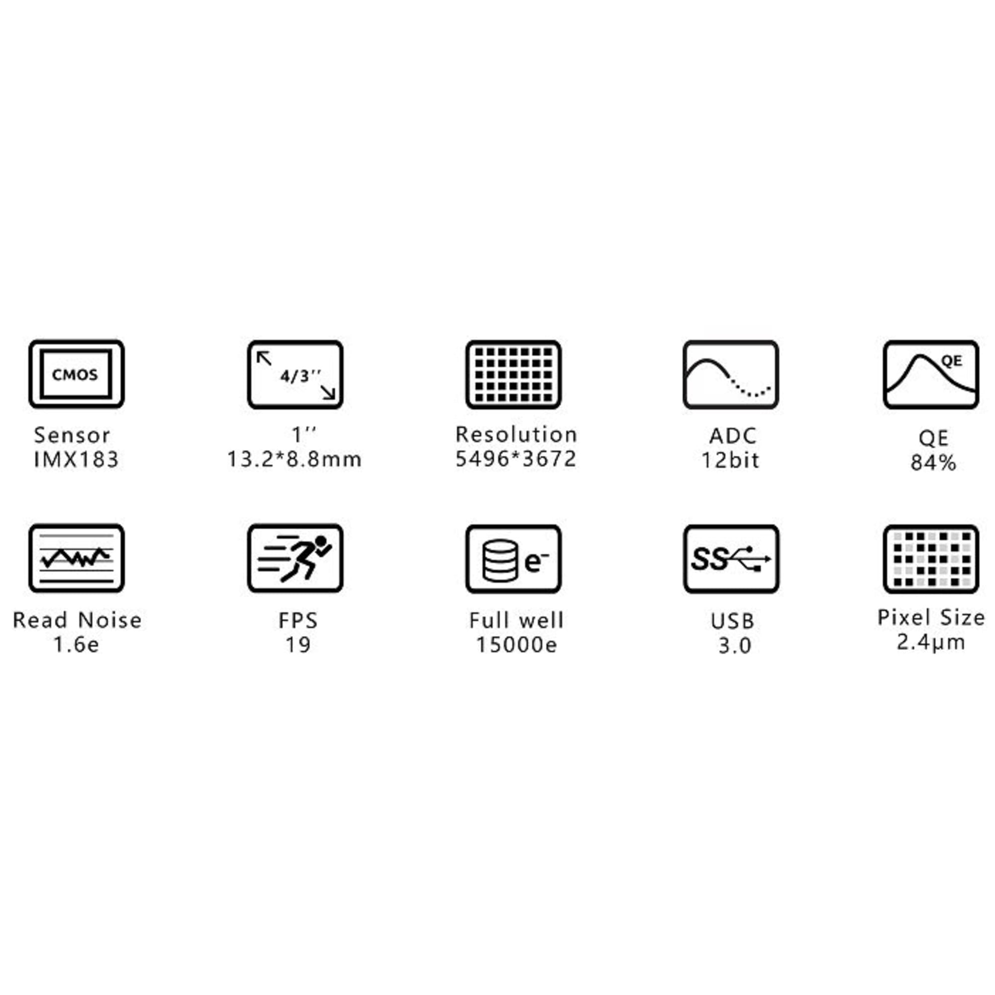 - Sensor: Sony IMX183 (kleur, CMOS, BSI)