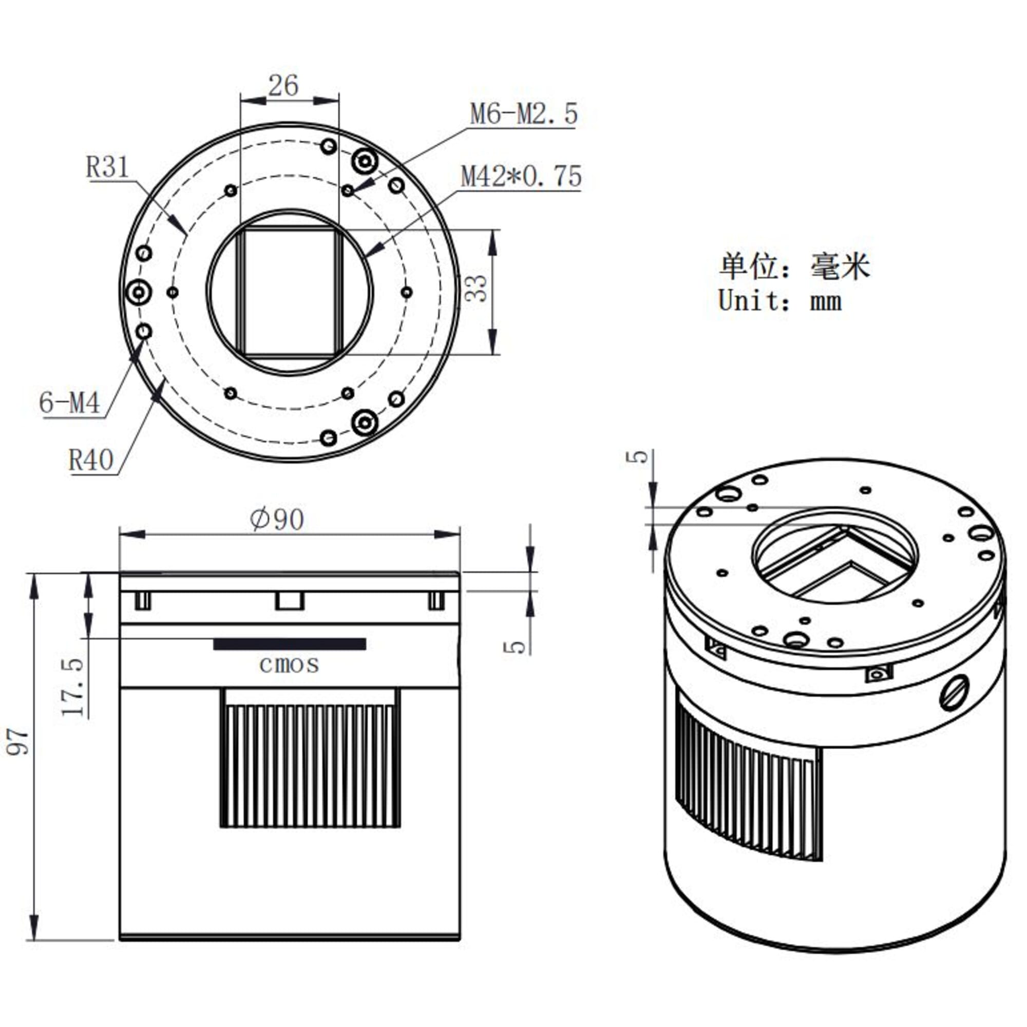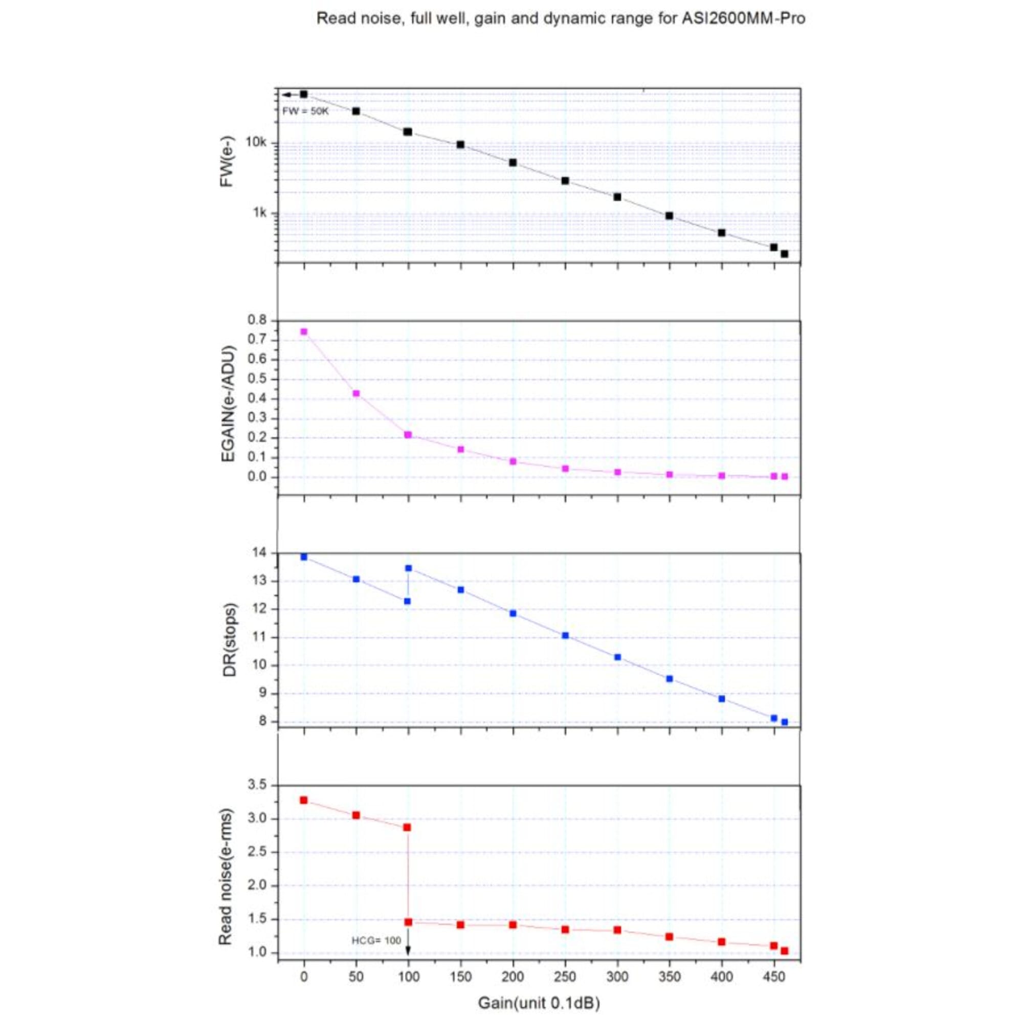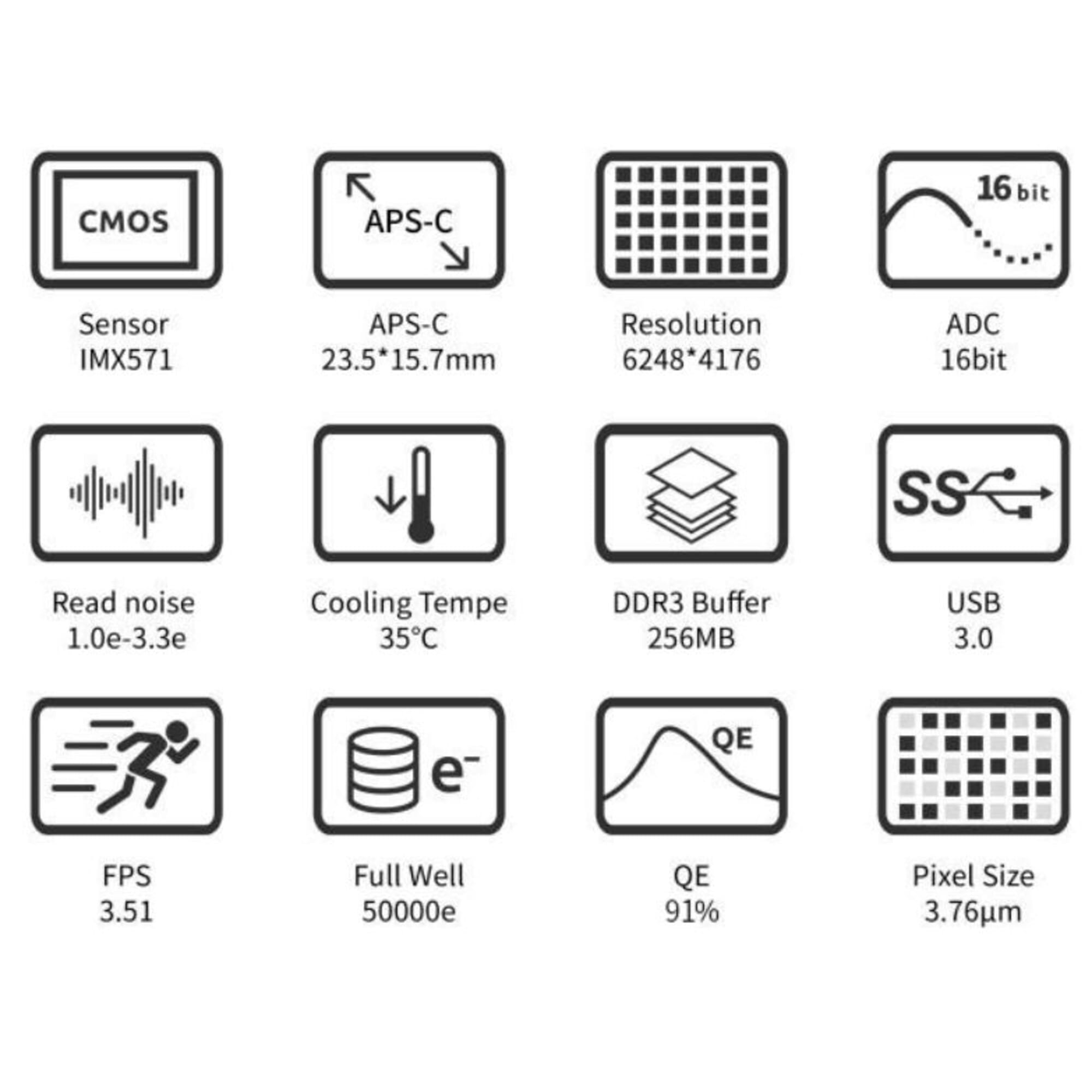 • Sony IMX571 sensor (mono, 26 MP) – 3,76 µm pixels, 16-bit ADC, dynamisch bereik van 14 f-stops