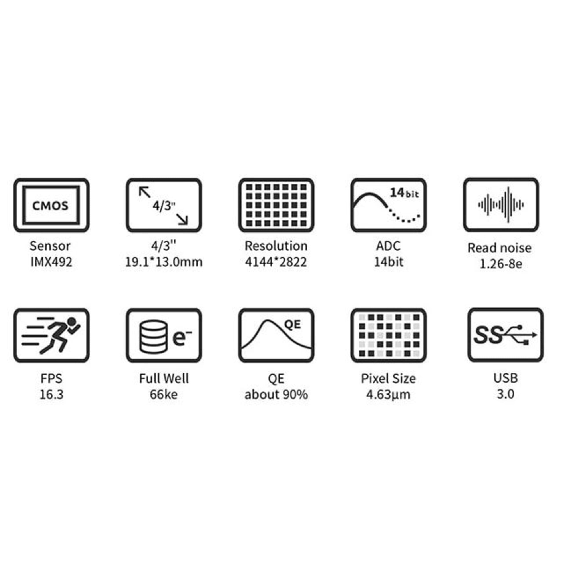 - Sony IMX492 monochrome sensor (11,7 MP) – 4,63 µm pixels (of 2,3 µm in unlocked mode)