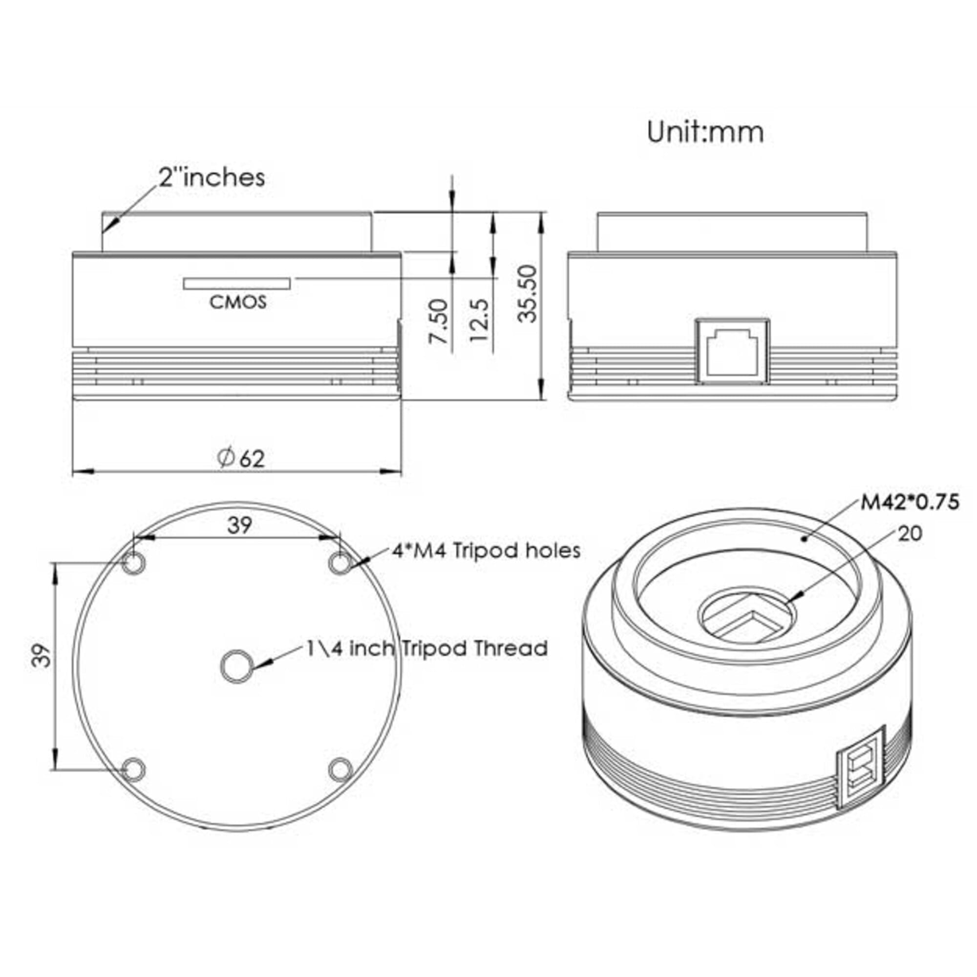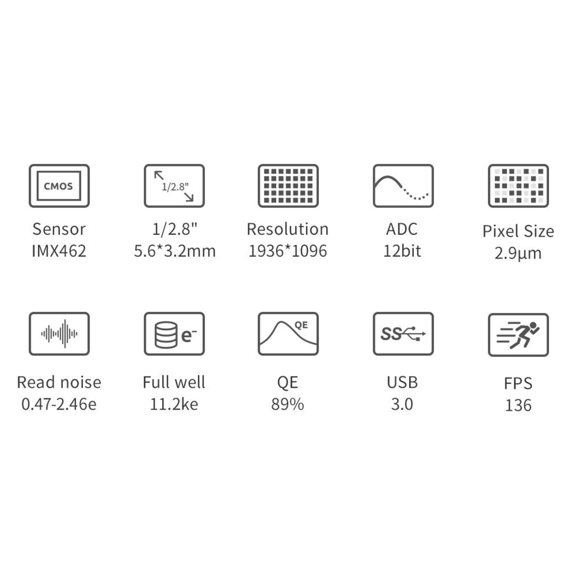 - Sony IMX462 sensor (2,1 MP) – 2,9 µm pixels, 1936 × 1096 resolutie