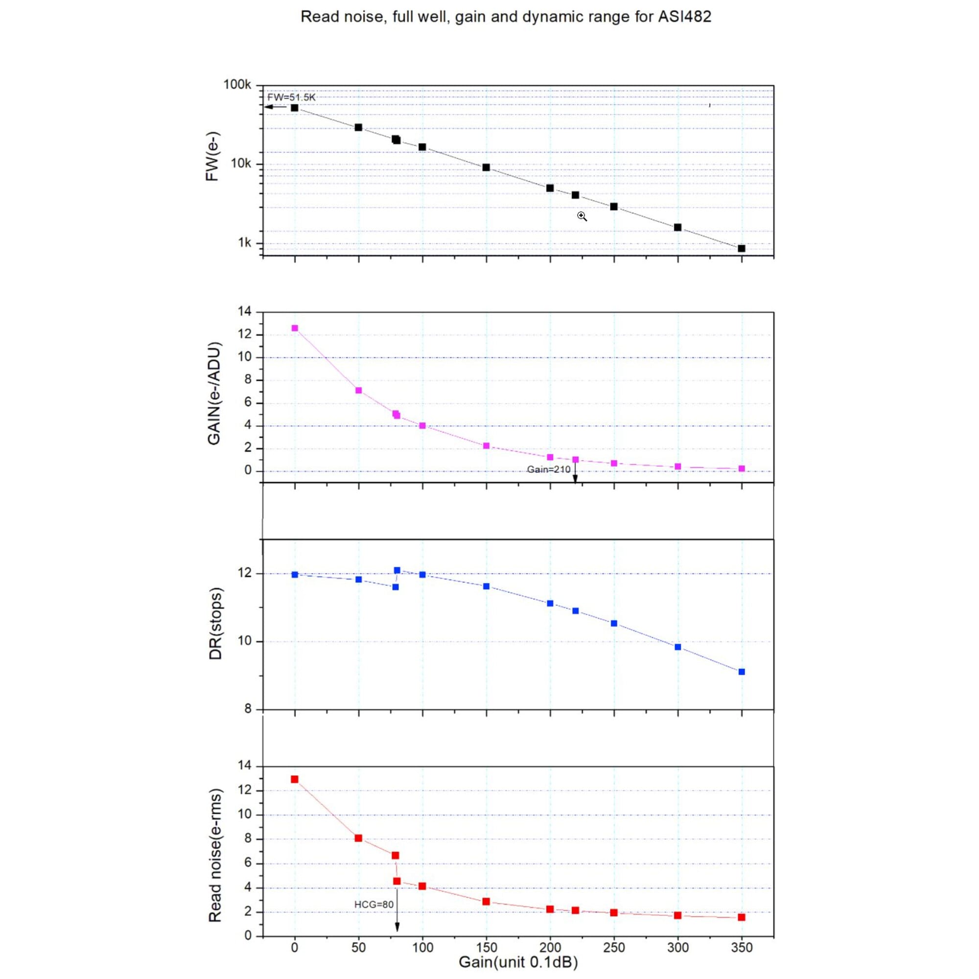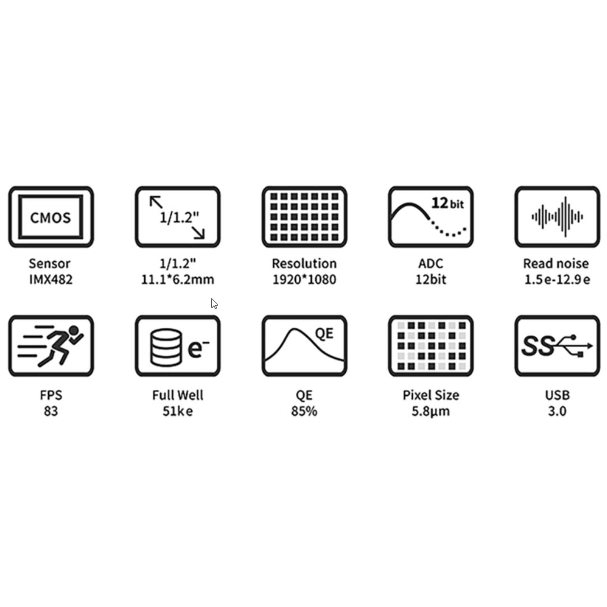 - Sony IMX482 sensor (2,07 MP) – 5,8 µm pixels voor uitstekende lichtgevoeligheid
