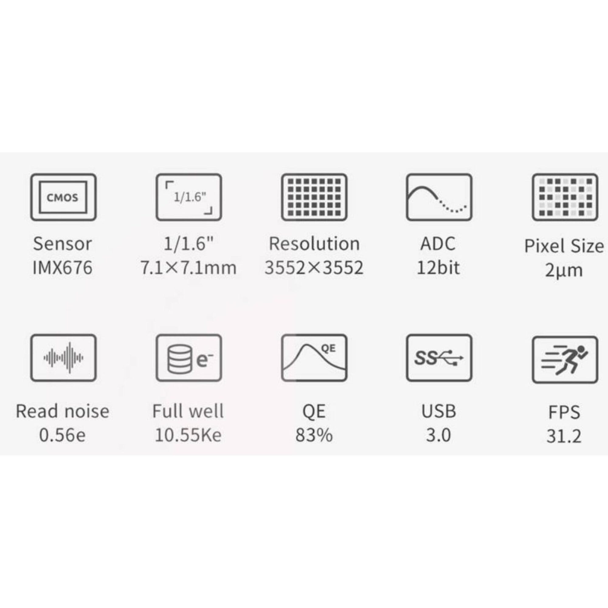 De ZWO ASI676MC is een veelzijdige kleurencamera met een uniek vierkant sensorformaat, speciaal ontwikkeld voor all-sky opnames, meteorenjacht en planeetfotografie in hoge resolutie. De Sony IMX676 Starvis 2-sensor levert een resolutie van 3552 × 3552 pixels (12,6 MP) en combineert achtergrondverlichting met volledig amp glow-vrije prestaties. Daardoor maak je scherpe, ruisvrije beelden, zowel bij korte als langere belichtingen.