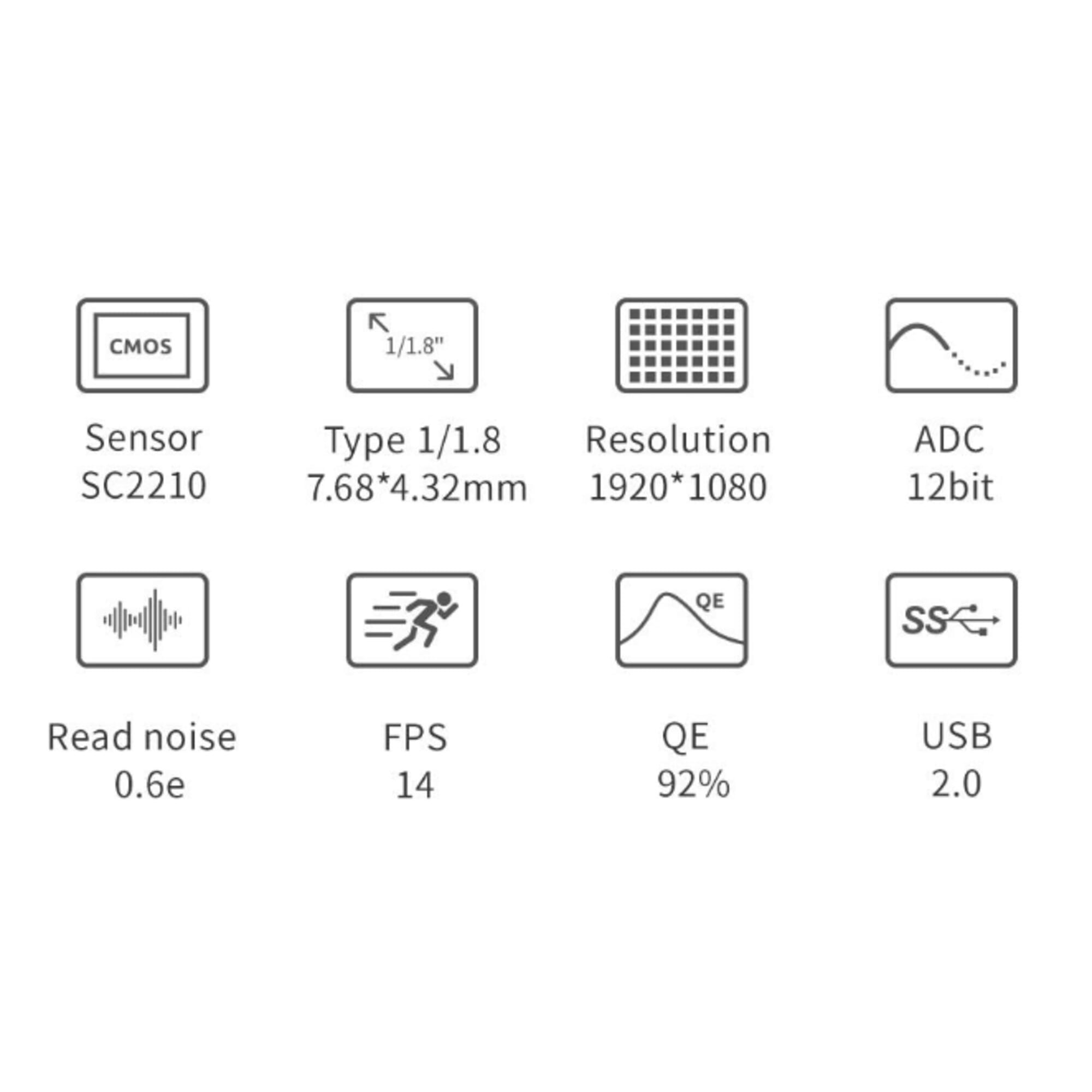 ✔ SC2210 monochrome sensor – 2,07 MP met hoge quantum efficiency (92%)